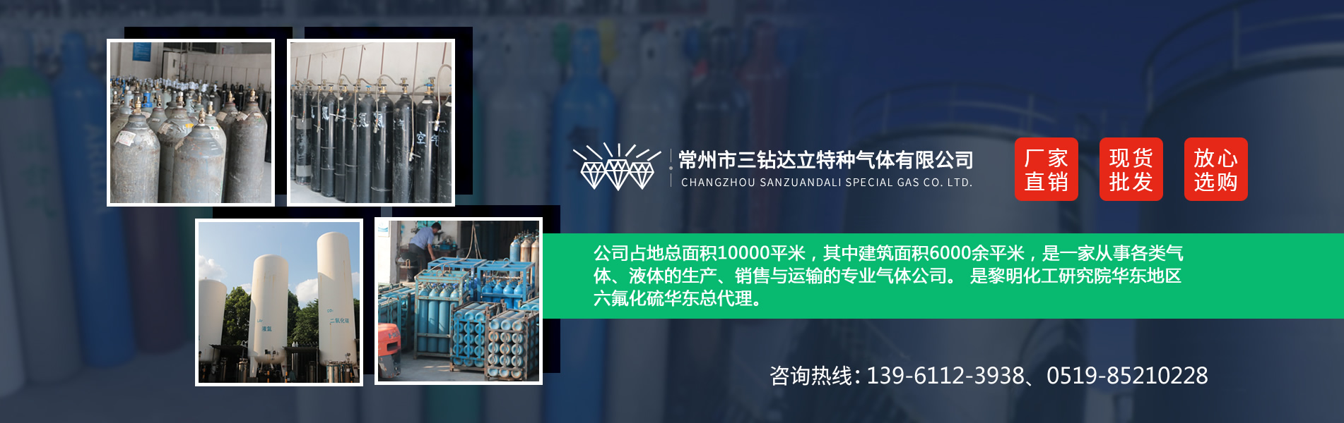 常州市三鉆達(dá)立特種氣體有限公司,成立于一九九五年。座落于常州市新北區(qū)高新技術(shù)產(chǎn)業(yè)開(kāi)發(fā)區(qū)龍虎塘工業(yè)園,緊靠滬寧高速出口處、常澄路、通江大道橫貫,交通方便快捷,區(qū)位優(yōu)勢(shì)明顯。公司占地總面積10000平米,其中建筑面積6000余平米,是一家從事各類(lèi)氣體、液體的生產(chǎn)、銷(xiāo)售與運(yùn)輸?shù)膶?zhuān)業(yè)氣體公司。 是黎明化工研究院華東地區(qū)六氟化硫華東總代理。